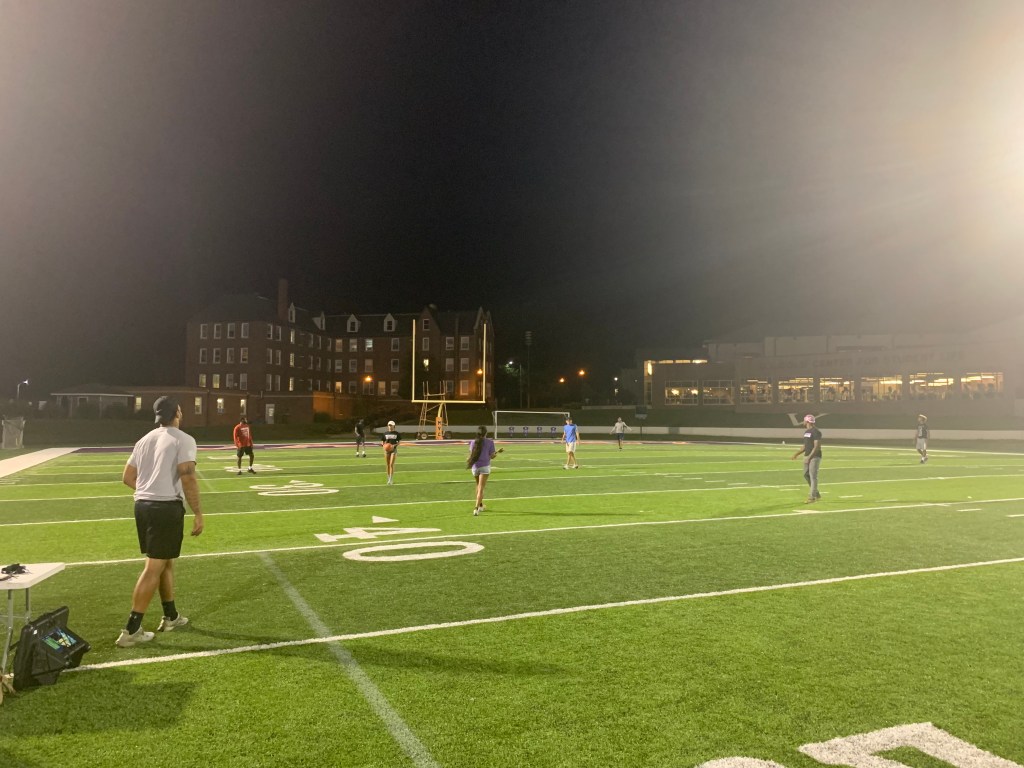 Missouri Valley College students participate in an intramural kickball tournament held on the football field. Students were allowed to make a team of 10 with at least three female members. The winners of the single-elimination tournament took home a $100 prize. Photo by Chardonnae Parker.