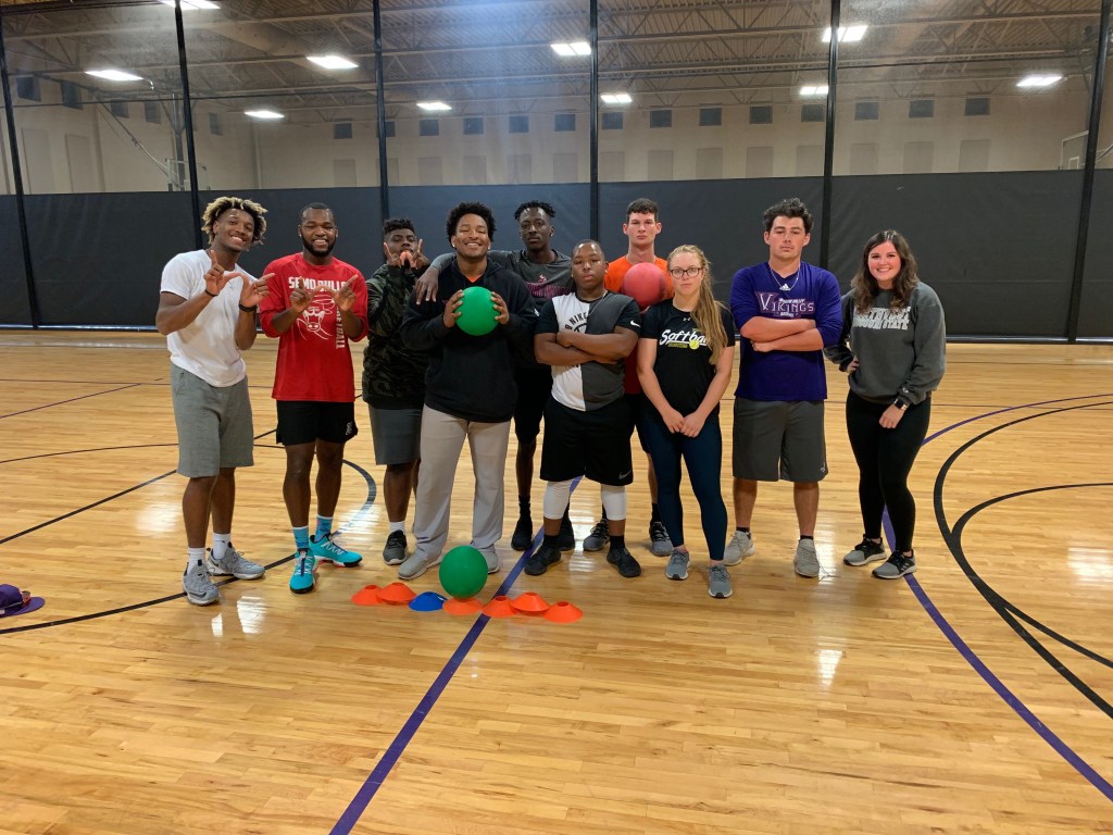 The intramural dodgeball winners Team Takeoff pose to celebrate their victory. The games were played in a single day single-game elimination tournament. The winners were rewarded with a $100 gift card.