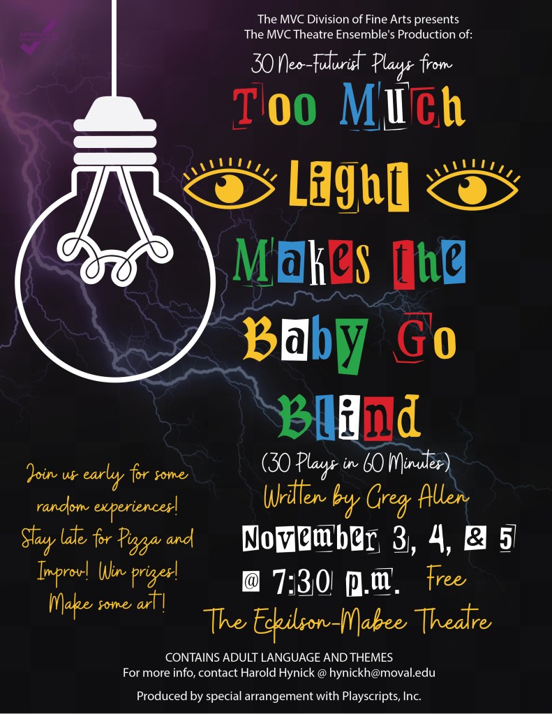 The Missouri Valley College Theatre Ensemble will be performing the production “Too Much Light Makes the Baby Go Blind”, 30 plays in 60 minutes. Written by Greg Allen, the production presents 30 Neo-Futurist plays and involves the audience’s participation to decide the direction of the performances.