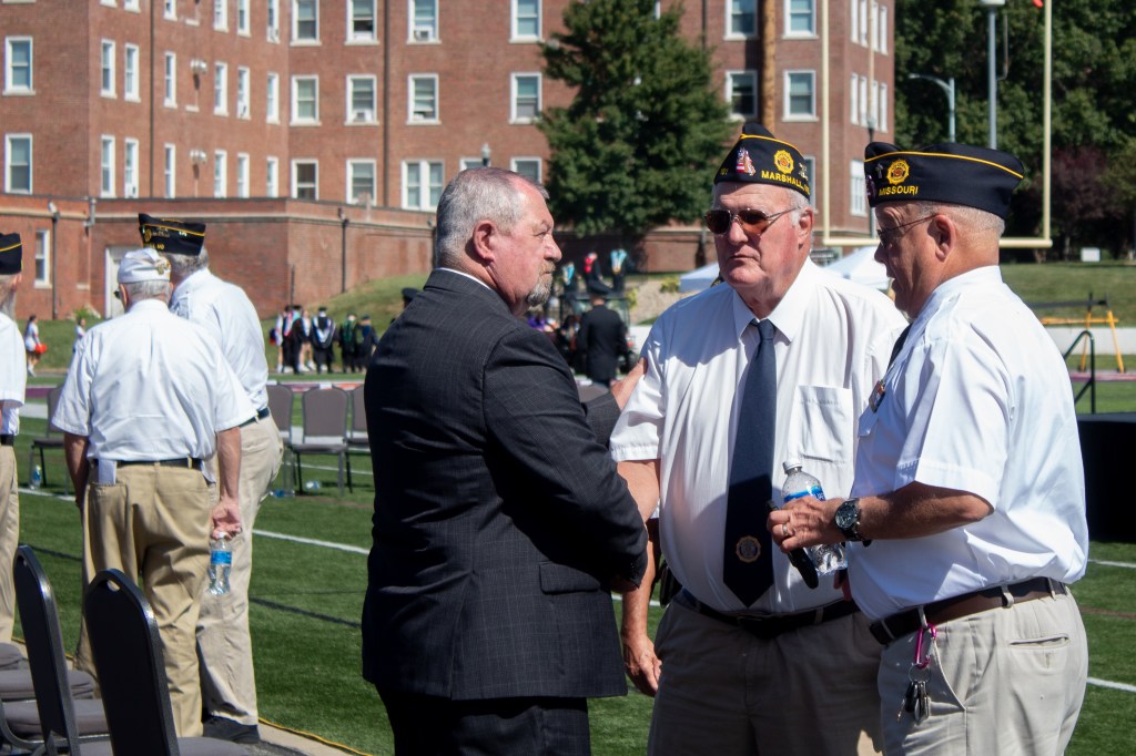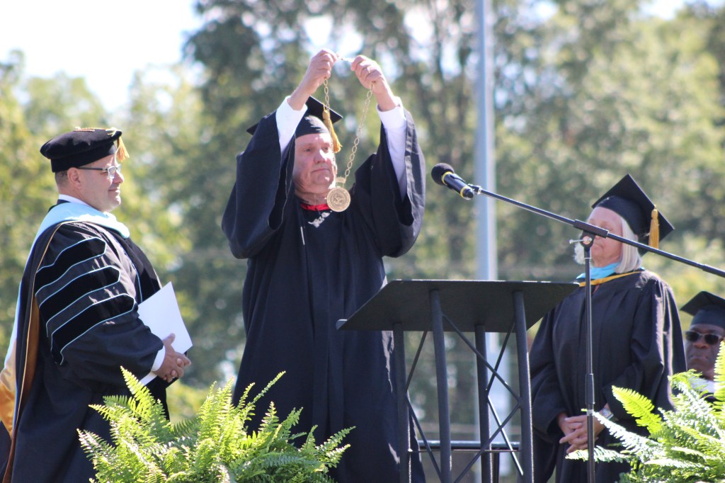 Missouri Valley College installed its 14th president during this year’s convocation. Dr. Joe Parisi donned the president’s medallion presented to him by the board of trustees chairman, Matt Huston.
