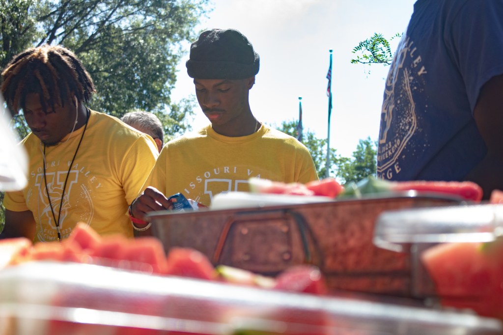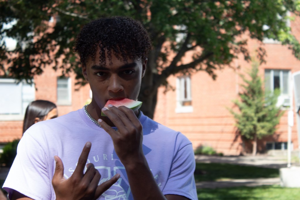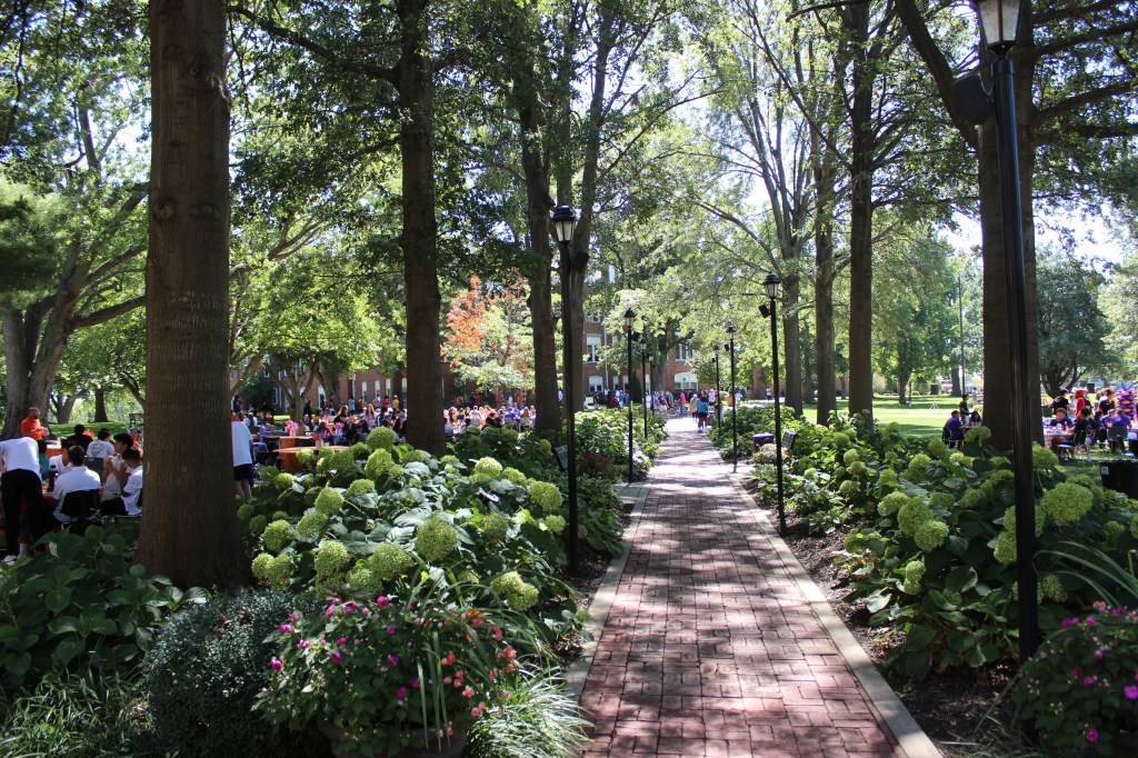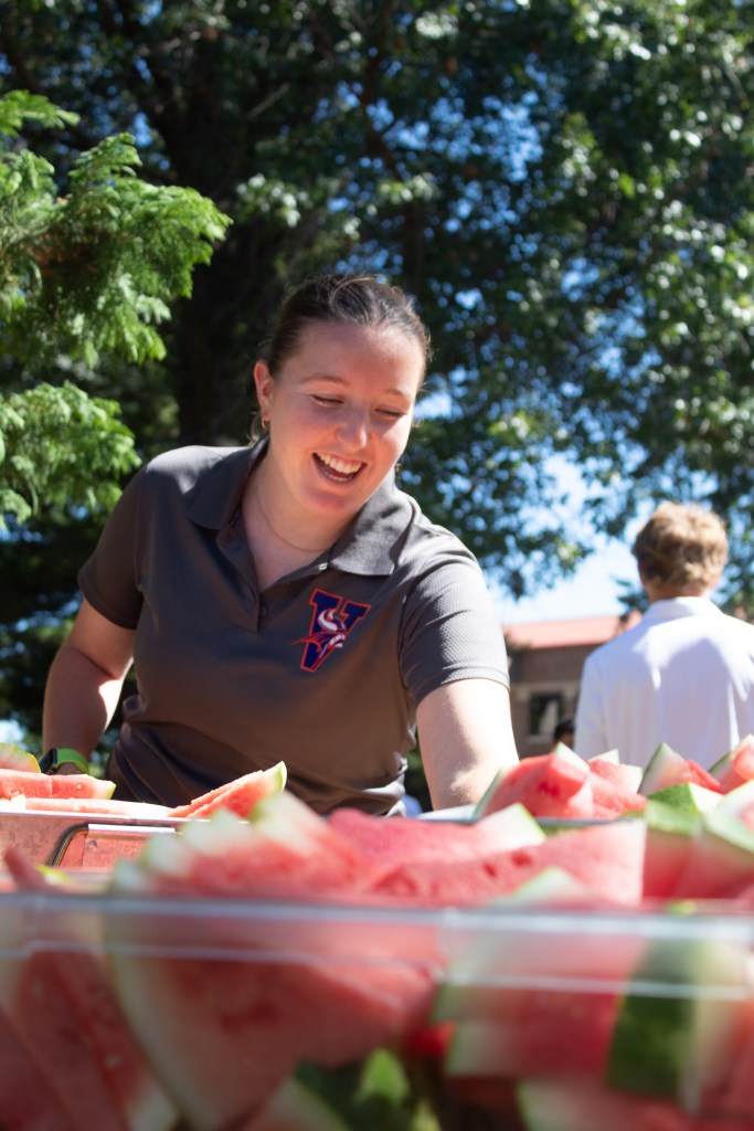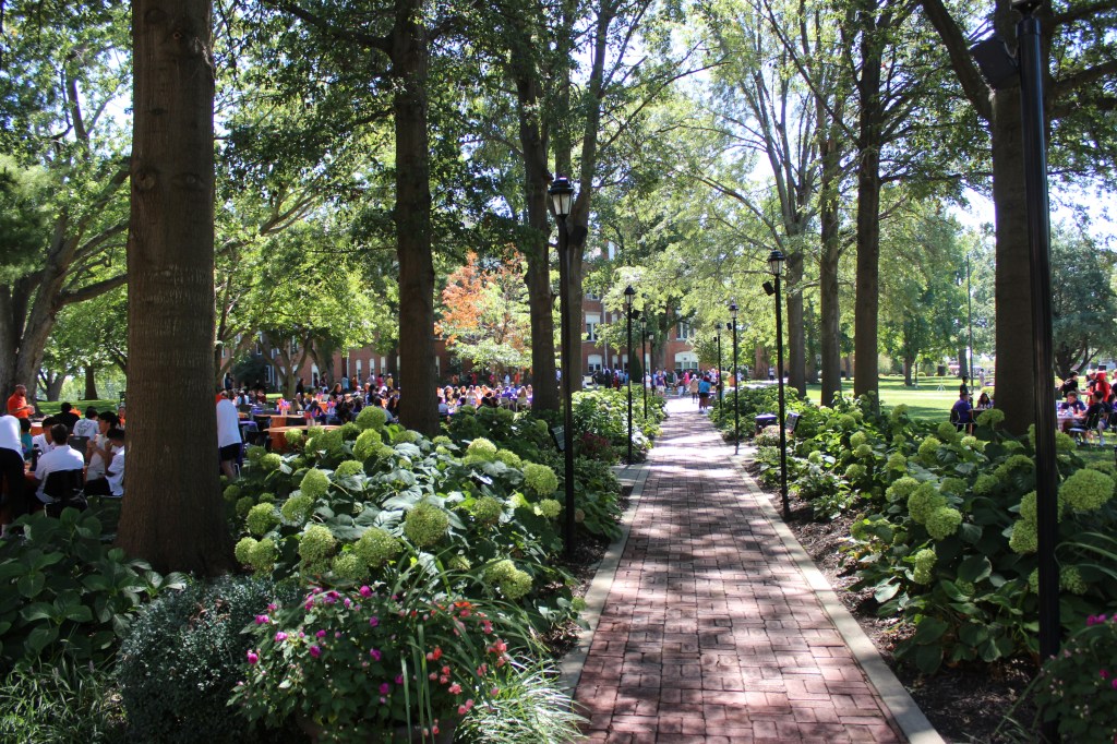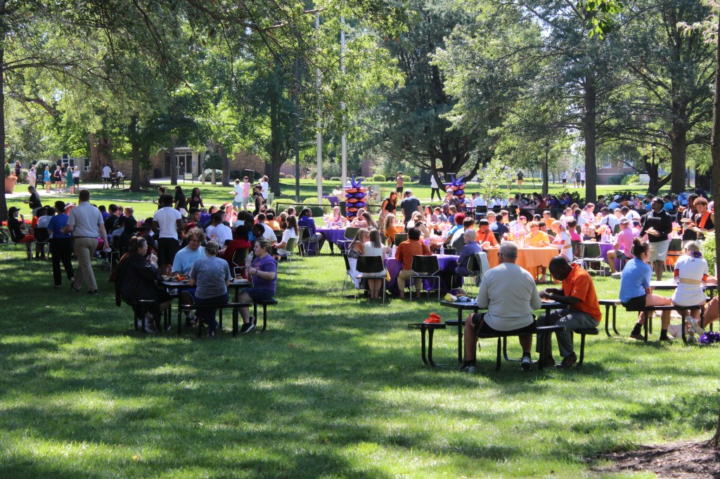 After the ceremony on Gregg-Mitchell field, President Parisi and his audience moved to the quad for an all-campus picnic. Six rows of hungry students, faculty, staff, and visitors formed in front of the trays full of pulled pork, sausages, macaroni salad, and baked beans.